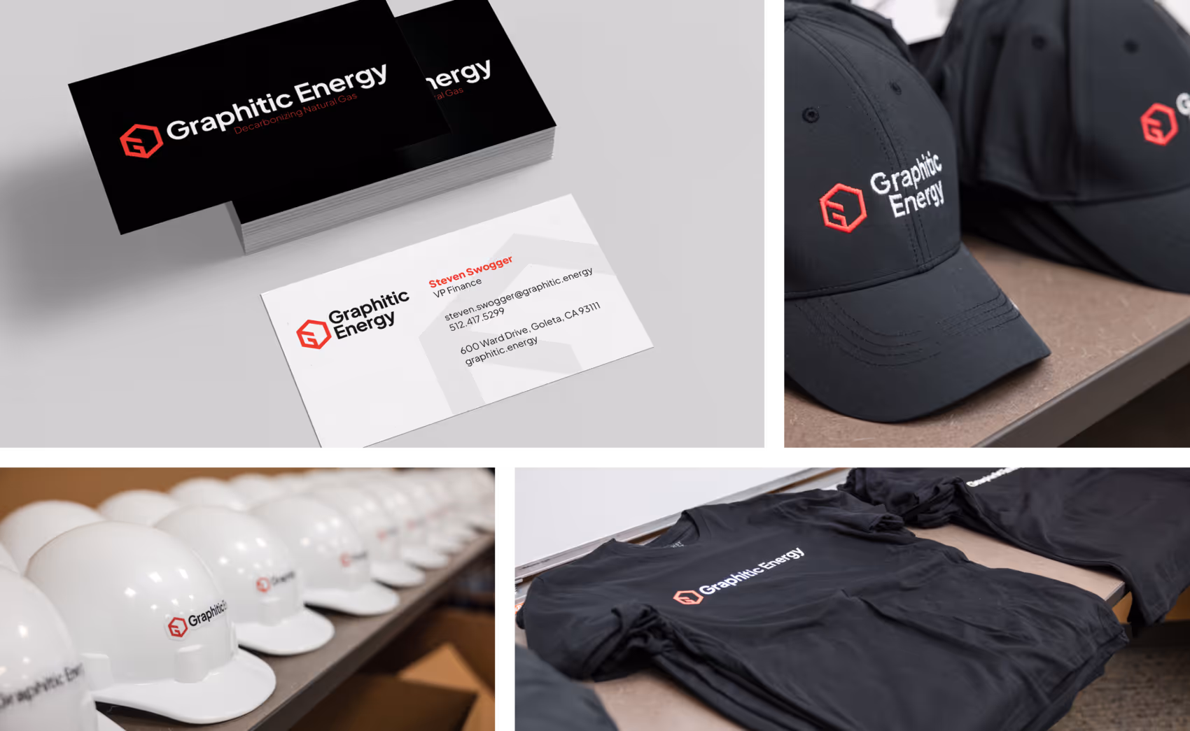 New company logo: Ryan Schlegel, the project’s lead designer, took the reins to reinvent Graphitic Energy’s visual identity. From the beginning, Graphitic indicated an interest in the number 6 (the atomic number for carbon) and hexagons, which correspond to the molecular structure of the company’s graphitic carbon. Many of Ryan’s initial concepts — including the design that Graphitic selected as its new logomark — utilized hexagonal imagery. The full logo also includes the company’s name in a bespoke font Ryan selected specifically for the company’s use.