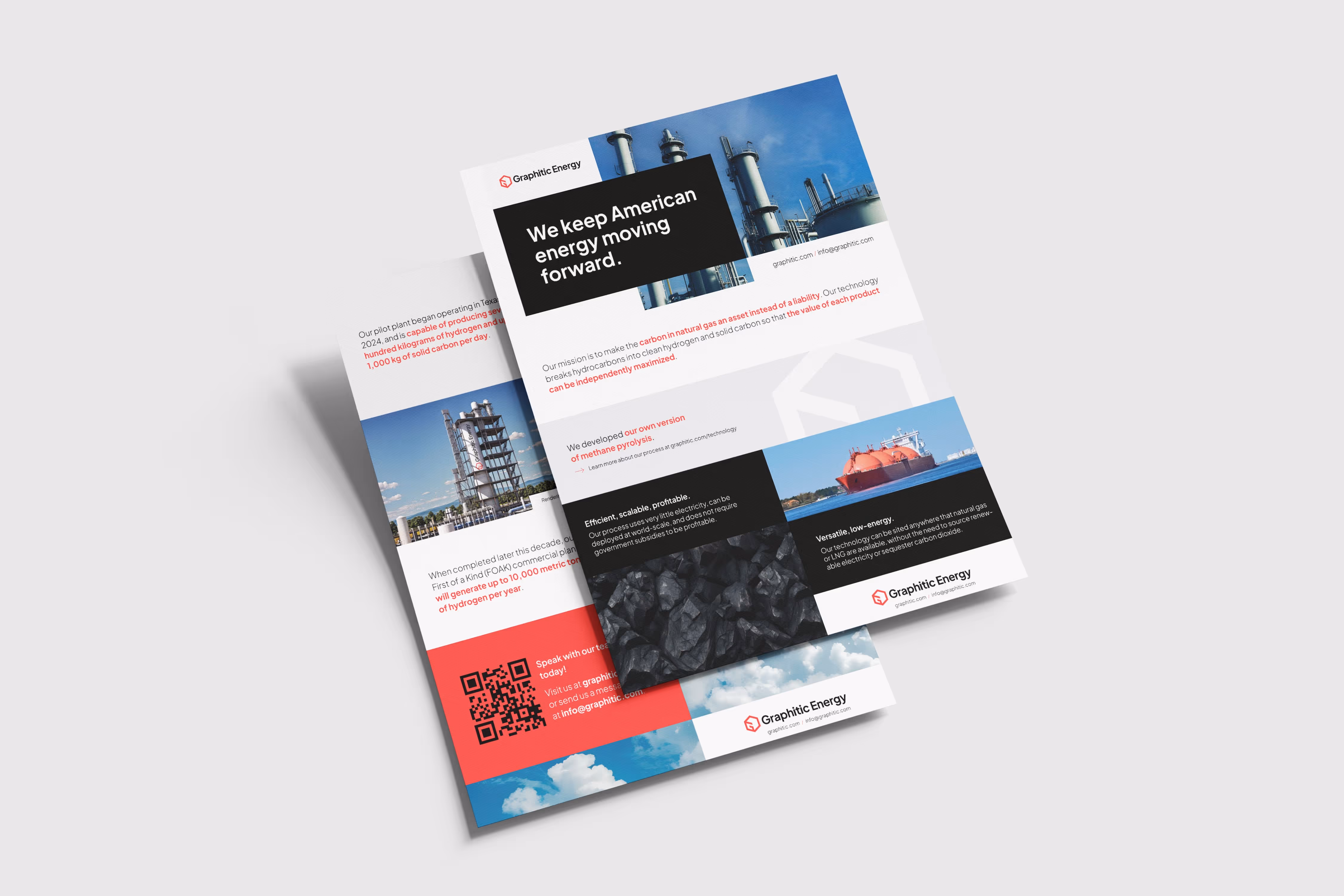 New website: DG+’s website copy sought to explain Graphitic’s novel technology to a broad audience while ensuring it could also elevate Graphitic’s standing in the industry and inspire future investment. Graphitic welcomed Ryan’s unique web design ideas, which were brought to life by Nadia Johnson, the project’s lead developer. The immersive scrollytelling feature on Graphitic's "Technology" page explains Graphitic's process for converting natural gas into low-emission hydrogen and graphitic carbon using evocative imagery and dramatic spacing, creating an emotionally resonant experience that highlights Graphitic's unique capabilities and position in the market.